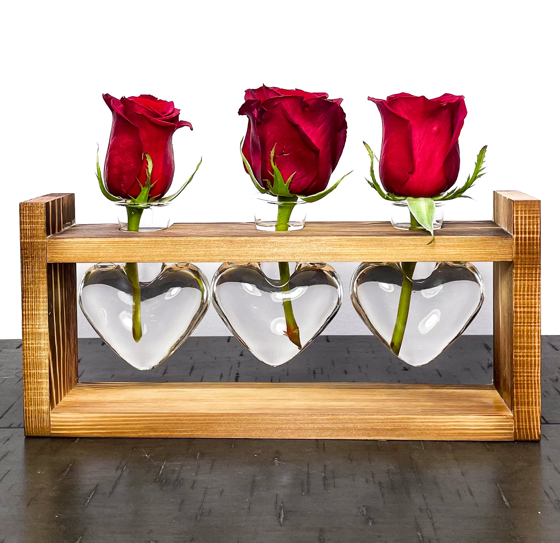 A Heartfelt Touch: These charming heart-shaped glass vases, nestled on a stylish wood stand, are sure to captivate your guests. Fill them with vibrant blooms, creating a beautiful and romantic display. When the flowers are gone, use them to showcase your favorite plant clippings. A unique and thoughtful gift for any plant lover.