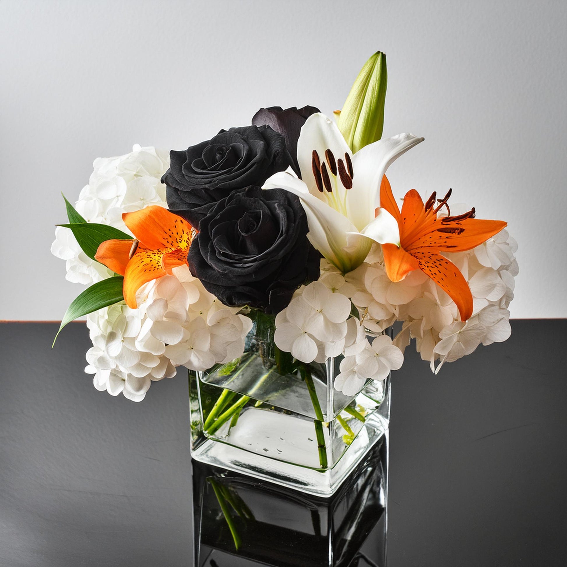 Get ready to spookify your space with our Spooky Cube! This medium-sized bouquet is a bewitching blend of hydrangeas, lilies, and mysterious black roses. Perfect for adding a touch of elegant eeriness to your Halloween festivities.