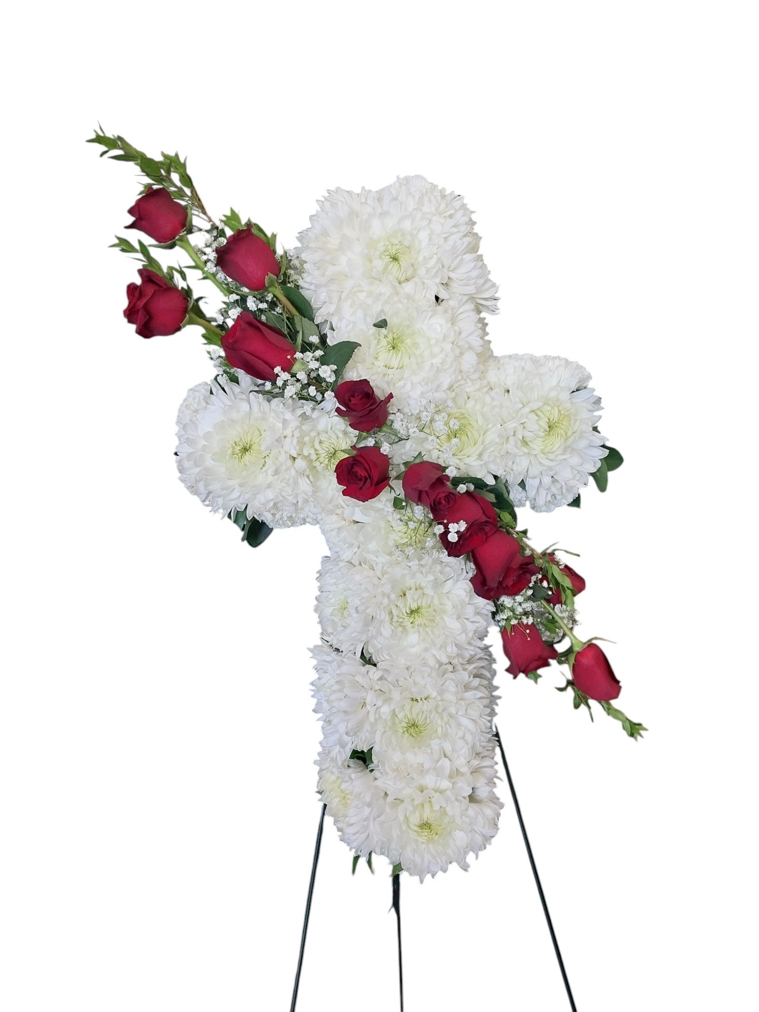 A symbol of faith and love, this funeral cross is crafted from a bed of pristine white blooms, accented by a cascade of rich red roses. The arrangement offers a touching tribute, expressing deep sympathy and respect.