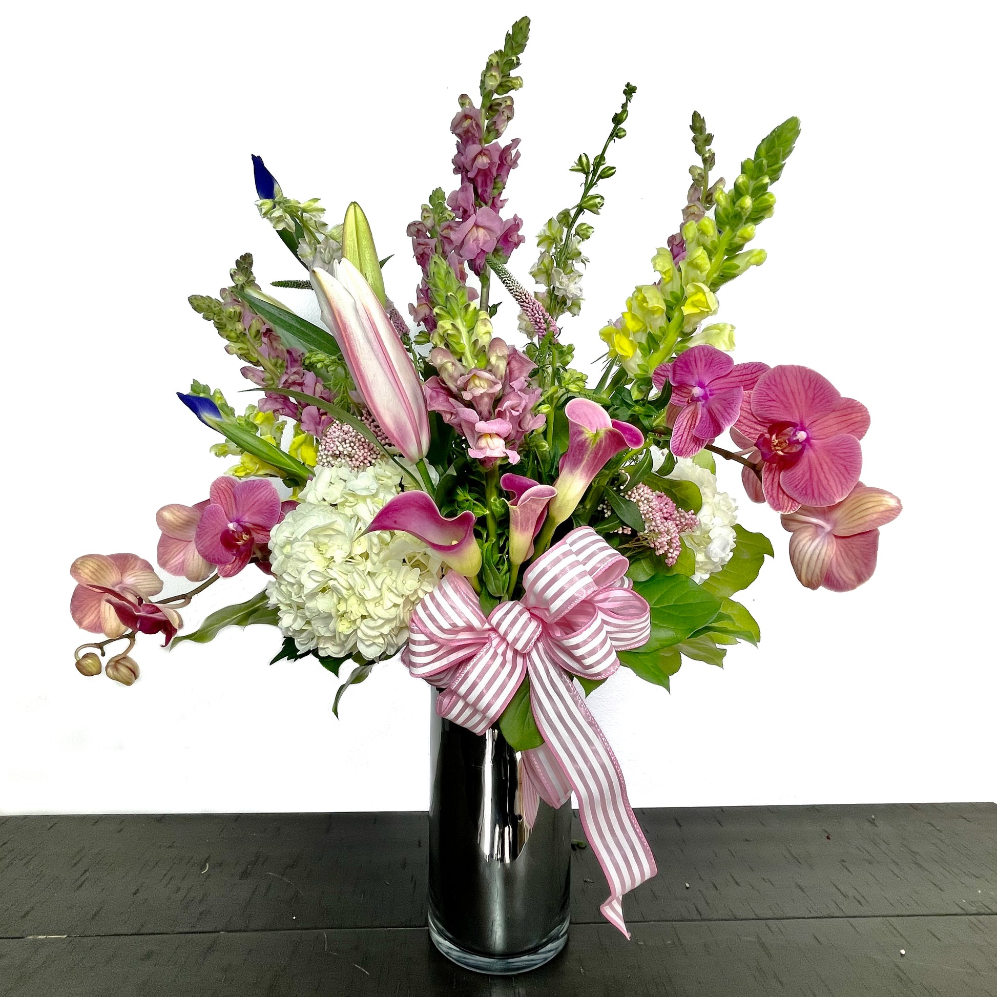 Indulge in the beauty of the Camelback Bouquet, a captivating floral masterpiece. This lavish arrangement overflows with vibrant snapdragons, exquisite orchids, and a symphony of blooms, transporting you to a serene paradise. A perfect gift for any occasion, or a luxurious treat for yourself. Vase will vary.