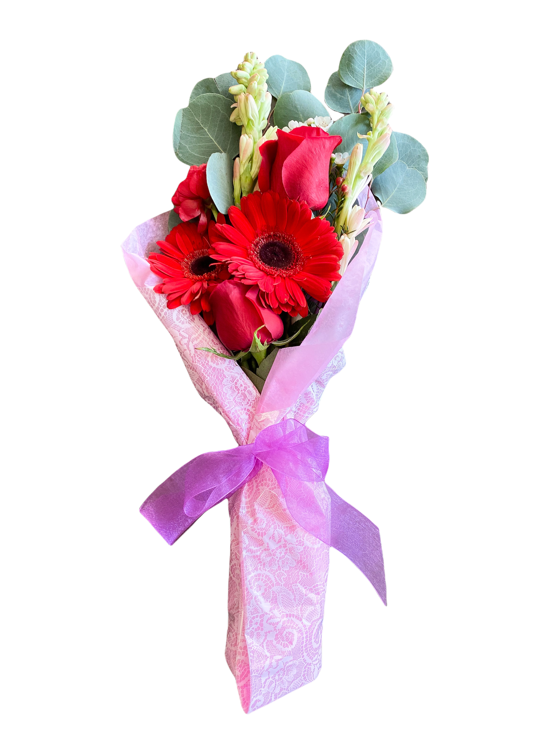 Ignite Passion: This vibrant bouquet bursts with mostly fiery red blooms, adding a touch of spice to any occasion. Featuring 7-9 stems of stunning flowers, lush greens, and delicate fillers, this arrangement is sure to make a lasting impression