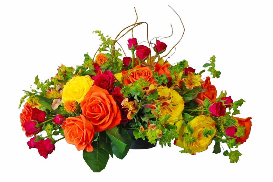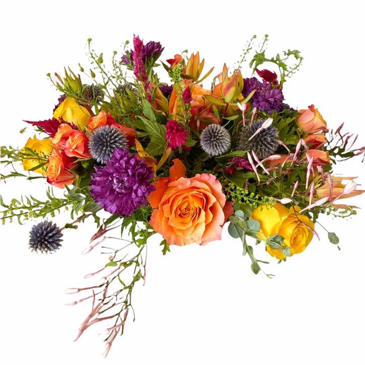 The Hostess's Secret Weapon: This captivating table arrangement is sure to wow your guests. A delightful mix of seasonal flowers in sunset colors creates a stunning centerpiece that will add a touch of charm to any dinner table