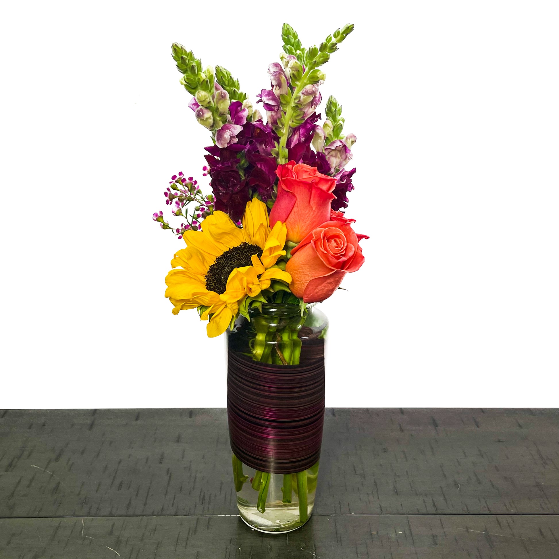The purr-fect addition to your home! A Stunning Arrangement, Safe for Pets! This vibrant bouquet features roses, sunflowers, snapdragons, and wax flower, carefully selected for their pet-friendly nature. Brighten your home with beautiful blooms while ensuring your furry friends stay safe.
