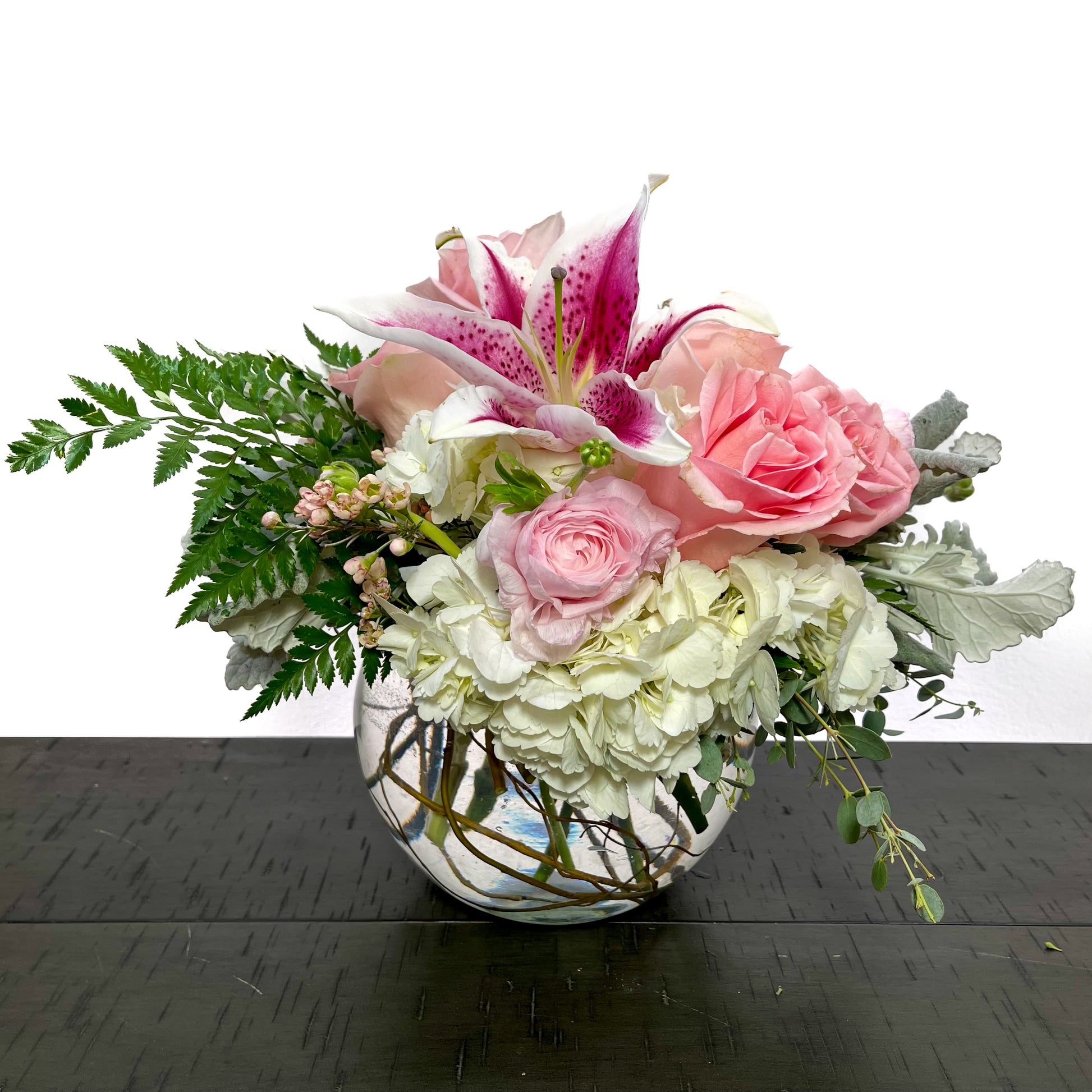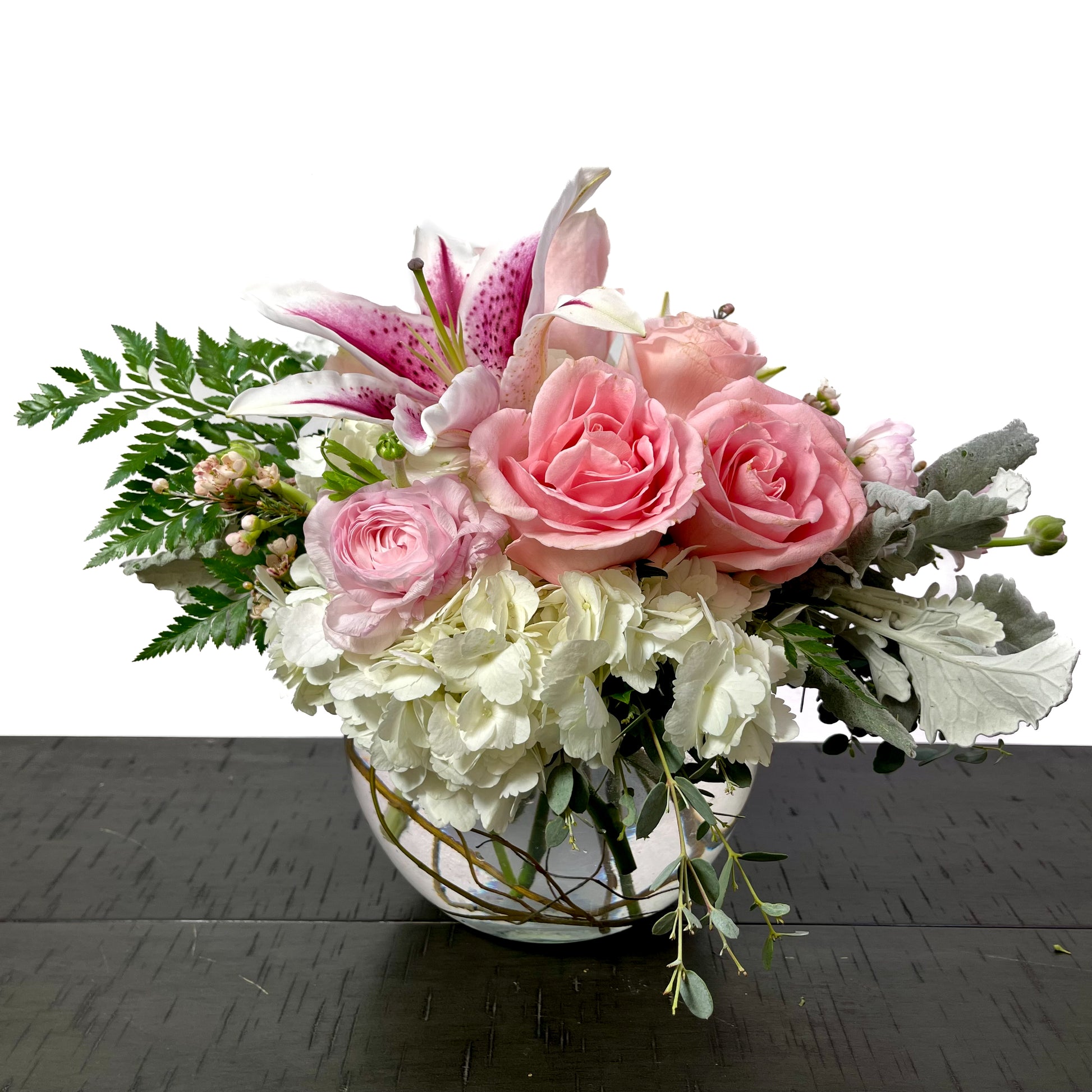 Indulge the pink lover in your life! This playful Pink Punch Bowl is overflowing with romantic pink roses, lilies, and seasonal flowers. Perfect for any occasion. Let the pink perfection take your breath away!