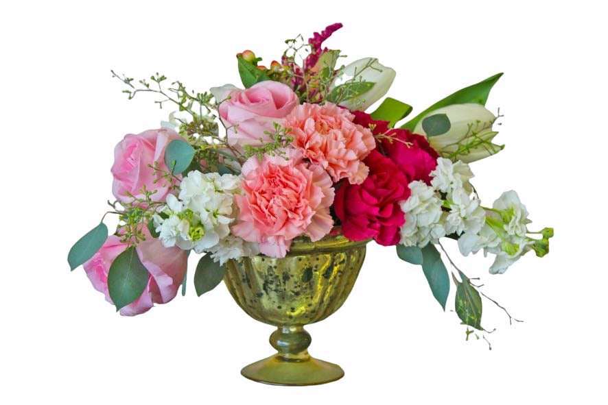 Designed as a stunning centerpiece, this lush arrangement showcases a captivating blend of pink and white flowers, featuring roses, carnations, tulips, seeded eucalyptus, and more, all artfully arranged for maximum impact.