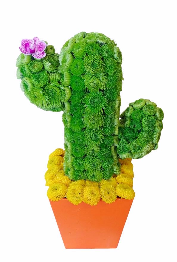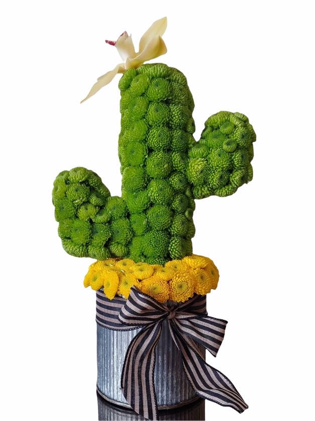Introducing Saguaro Jo: An enchanting arrangement that mimics the form of a majestic saguaro cactus, artfully constructed with vibrant button mums and crowned by a delicate flower. A truly one-of-a-kind creation that's both whimsical and sophisticated.