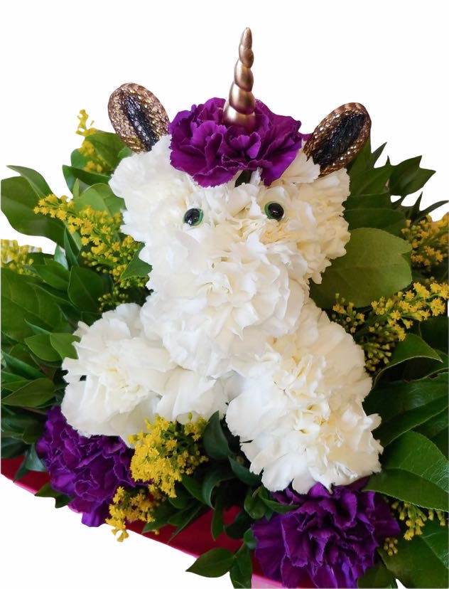 Sheenacorn: A playful and one-of-a-kind arrangement featuring carnations artfully crafted into a charming unicorn, perfect for a truly special occasion.