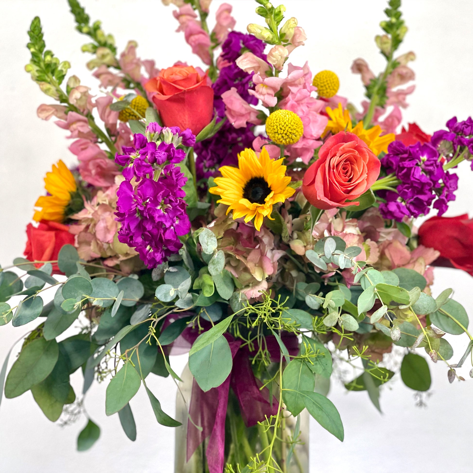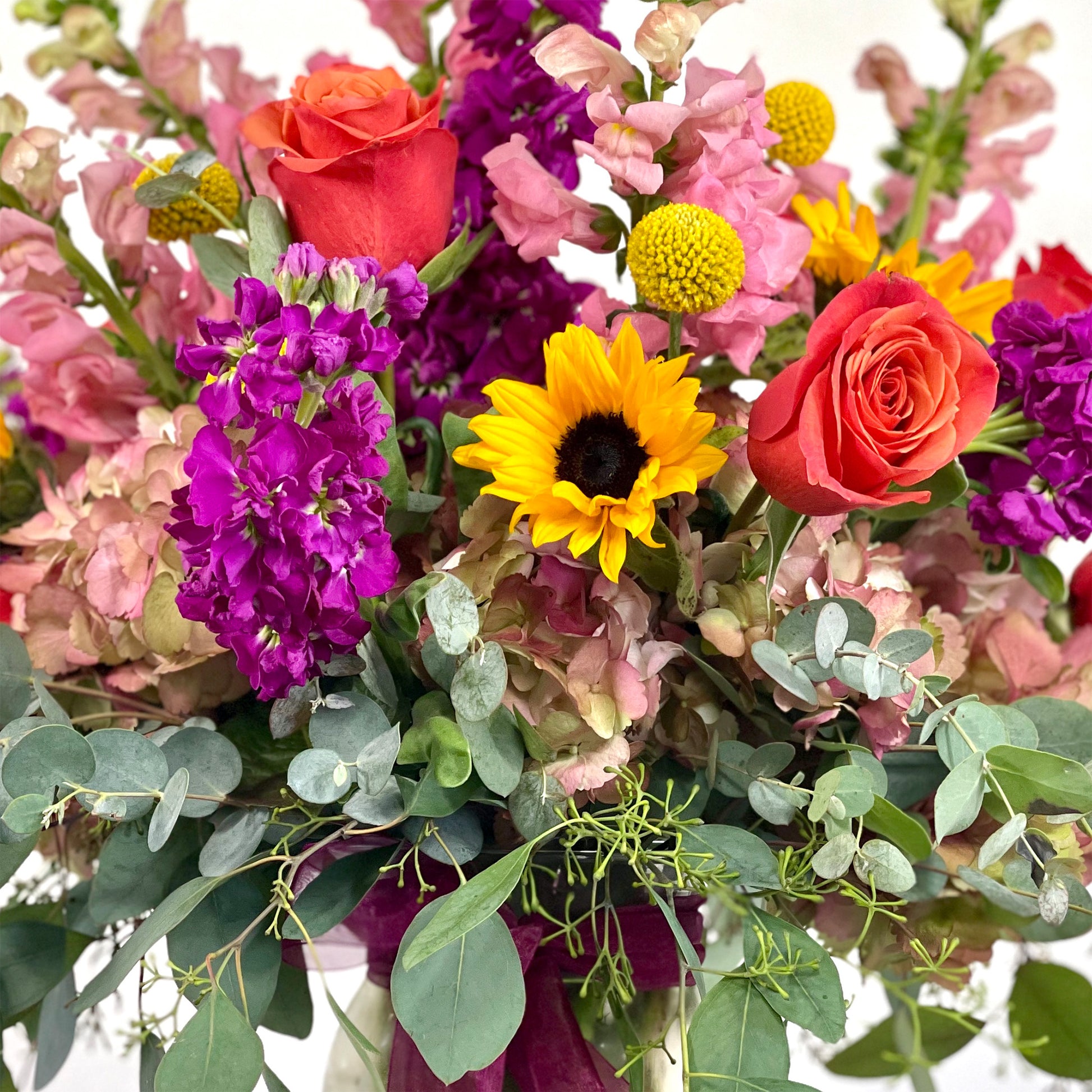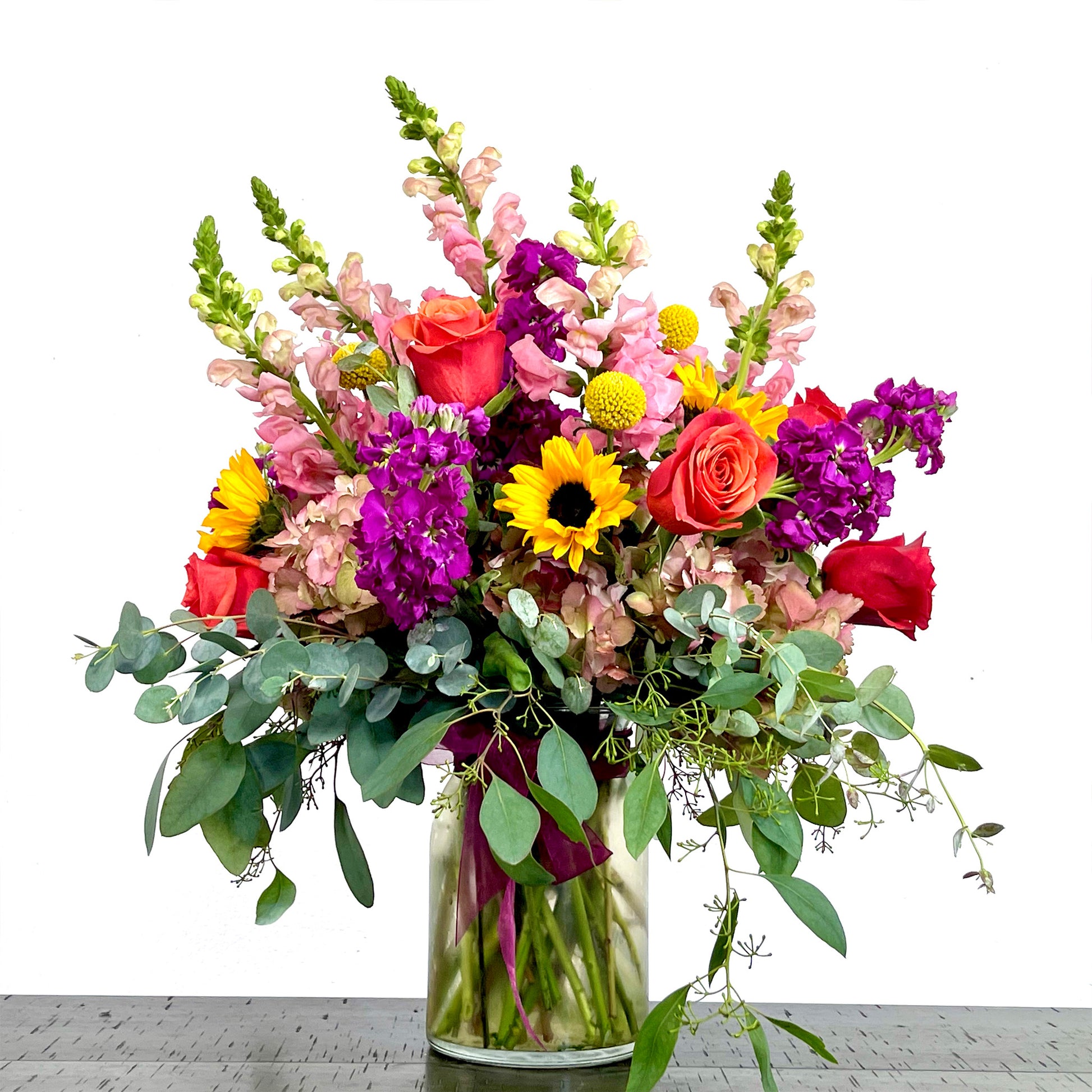 This floral arrangement is a gorgeous mix of sweet and colorful flowers! You'll find beautiful snapdragons, hydrangeas, and more.